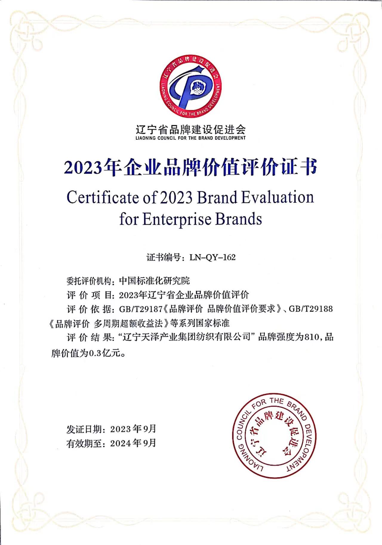 遼寧天澤紡織公司榮獲2023年企業(yè)品牌價(jià)值評(píng)價(jià)證書